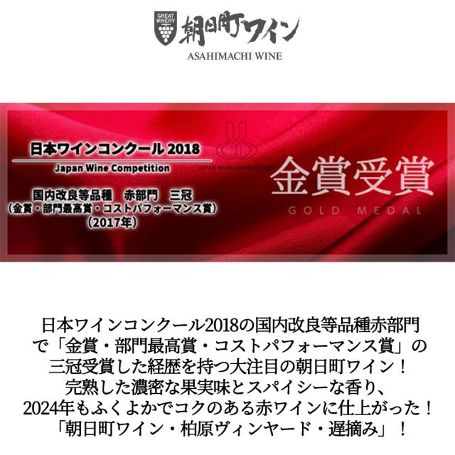 日本ワインコンクール2018の国内改良等品種赤部門で「金賞・部門最高賞・コストパフォーマンス賞」の三冠受賞した経歴を持つ大注目の朝日町ワイン!完熟した濃密な果実味とスパイシーな香り、2024年もふくよかでコクのある赤ワインに仕上がった!「朝日町ワイン・柏原ヴィンヤード・遅摘み」!
