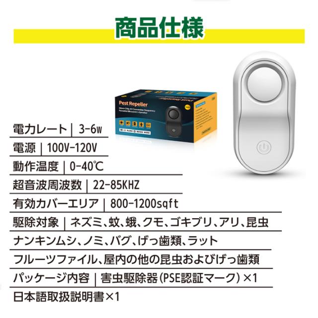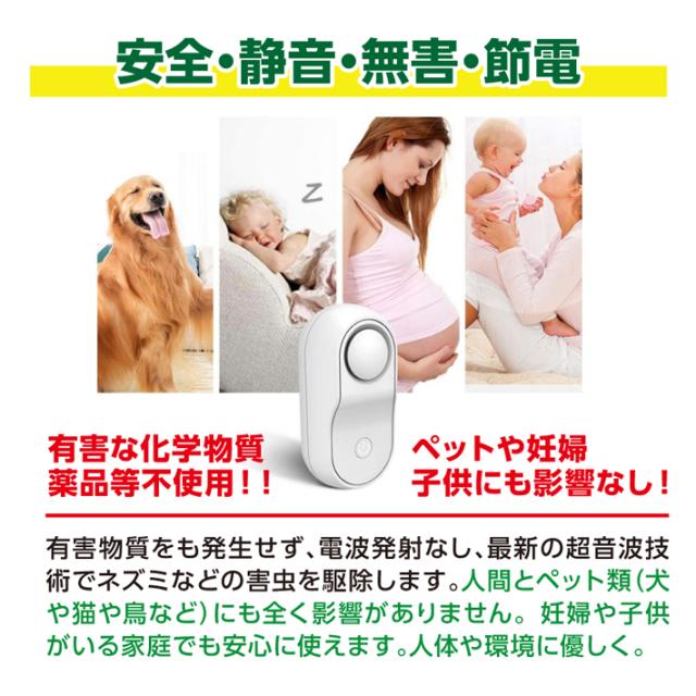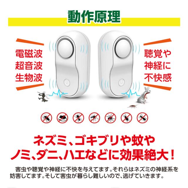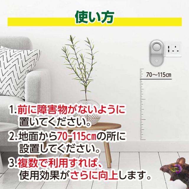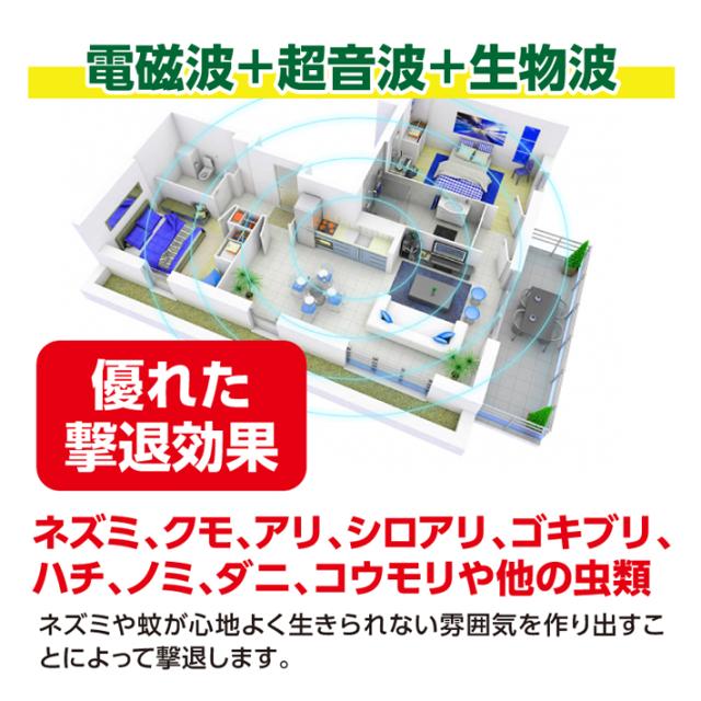 【電磁波+超音波+生物波】:ネズミ、クモ、アリ、シロアリ、ゴキブリ、ハチ、ノミ、ダニ、コウモリや他のムシ類へは撃退効果が優れています。ネズミや蚊が心地よく生きられない雰囲気を作り出すことによって。 【安全静音無害節電】有害な化学物質や薬品等は使用せず、有害物質をも発生せず、電波発射なし、最新の超音波技術でネズミなどの害虫を駆除します。人間とペット類(犬や猫や鳥など)にも全く影響がありません。 妊婦や子供がいる家庭でも安心に使えます。人体や環境に優しく。