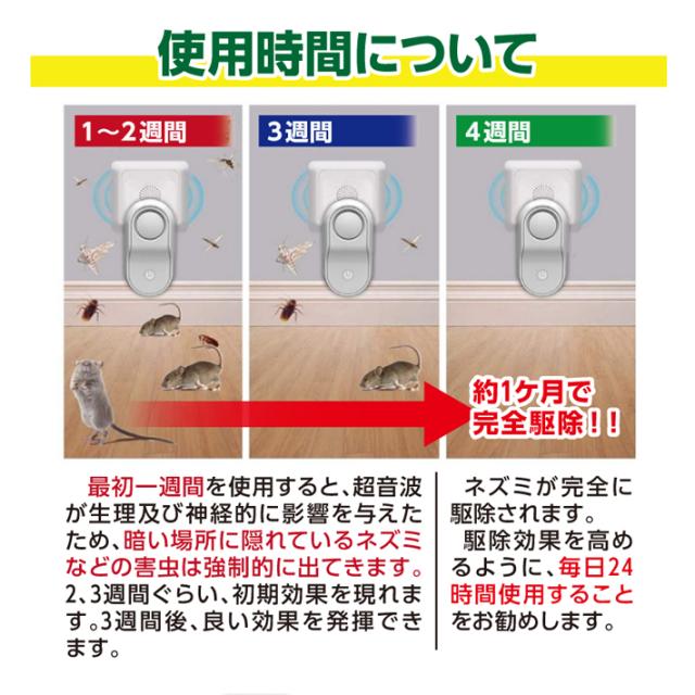【使用時間】最初一週間を使用すると、超音波が生理及び神経的に影響を与えたため、暗い場所に隠れているネズミなどの害虫は強制的に出てきます。2、3週間ぐらい、初期効果を現れます。3週間後、良い効果を発揮できます。大体1ヶ月ぐらい、ネズミが完全に駆除されます。さらに駆除効果を高めるように、毎日24時間使用することをお勧めします。