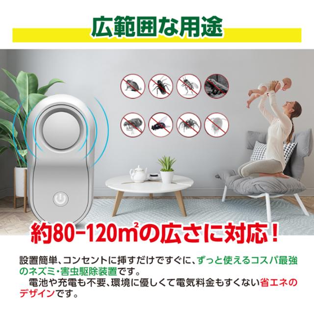 【広範囲な用途】ネズミ撃退器は約80-120m2の広さに対応!設置簡単、コンセントに挿すだけですぐ、ずっと使えるコスパ最強のネズミ・害虫駆除装置だ。電池や充電も不要、環境に優しくて電気料金もすくない省エネのデザインです。