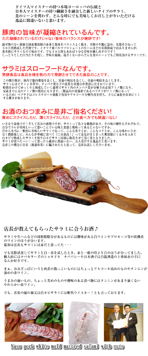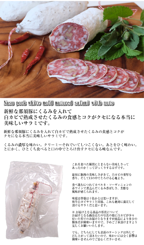 | 名称 | 新鮮な国産那須豚にくるみを入れて熟成させた白カビサラミ |