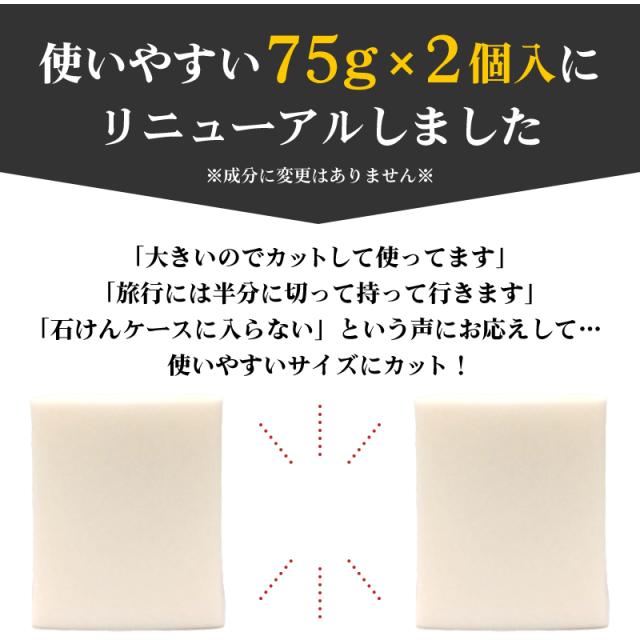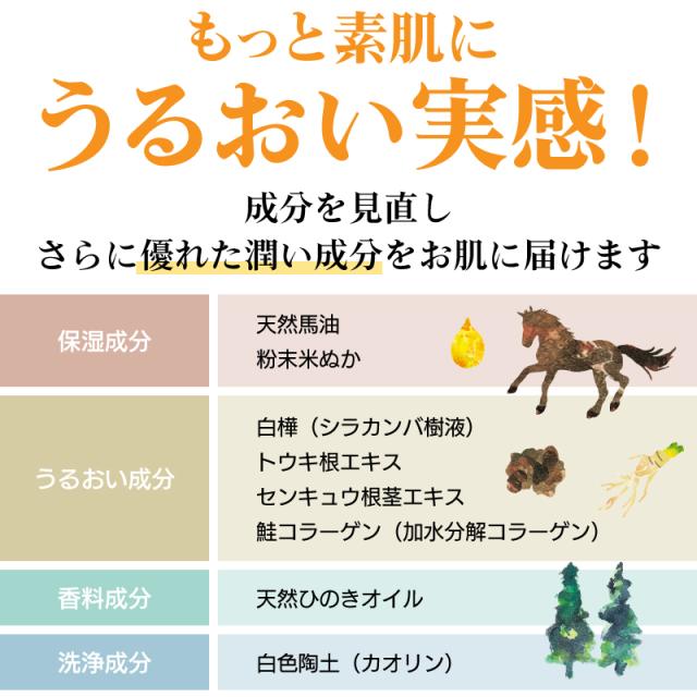 成分/石ケン素地・水・パーム脂肪酸・パーム核脂肪酸・香料・馬油・シラカンバ樹液・トウキ根エキス・センキュウ根茎エキス・加水分解コラーゲン・脱脂コメヌカ・オリザノール・スクワラン・カオリン・PPG-9ジグリセリル・グリセリン・塩化Na・カプロイルメチルタウリンNa・酸化チタン・EDTA-4Na・タルク・エチドロン酸・PEG-160M・エチドロン酸4Na・BG・ポリグリセリル-4ラウリルエーテル