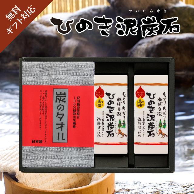 石けん ギフト ひのき泥炭石 タオルBセット(洗顔せっけん うるおいタイプ 150g(75g×2個)×2個/炭のタオル 1枚) のし・ギフト対応可【レビューを書いてポイント+3%】