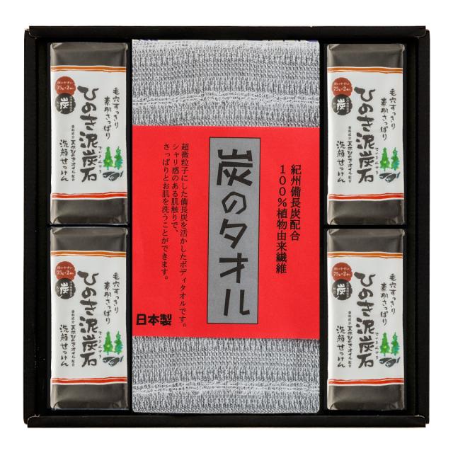 石けん ギフト ひのき泥炭石&炭のタオル スペシャルAセット(洗顔せっけん すっきりタイプ 150g(75g×2個)×4個/炭のタオル 1枚) のし・ギフト対応可【12/23(火)9時まで レビューを書いてポイント+3%】