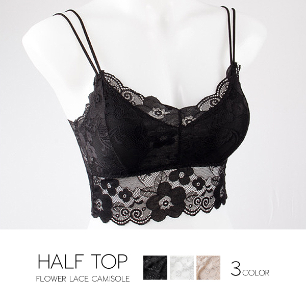 全3色!カップ入り花柄刺繍レースハーフトップキャミソール