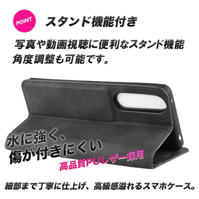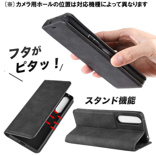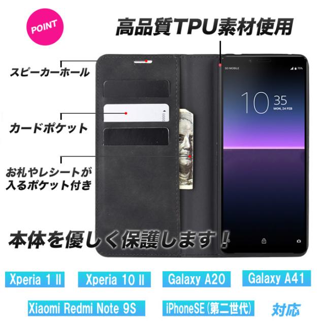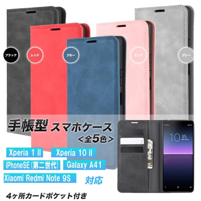 ※iPhoneSE版、GalaxyA41版はカードポケットが画像より1つ少ない仕様となっております。ご了承の上、お買い求めくださいませ高品質レザー使用した、高級感あふれる手帳型スマホケースです!●全5色から選べるオシャレな手帳型ケース●フタがピタッと閉まるマグネット式でとても便利です●スタンド機能付で写真や動画視聴に最適!●合計4ヶ所のカードポケットを内蔵し、通勤用定期やポイントカード、頻繁に使用するカードを素早く取り出せます●スマホ装着部にはTPU素材を用いており、着脱が簡単です。多機能でおしゃれなスマホケースなので、プレゼントにもオススメです。※商品画像にあるカメラ用ホールの位置は対応機種によって異なります。※実物の色に近づけるように心がけておりますが、お使いの環境により画像の色が実物の色と違って見える場合があります。●カラー: 以下からご選択くださいブラック / レッド / ブルー / ピンク / グレー●対応機種: 以下からご選択ください・iPhoneSE(第二世代)/8/7・Xperia 1 II・Xperia 10 II・Galaxy A20・Galaxy A41・Xiaomi Redmi Note 9S●素材: PUレザー、PU