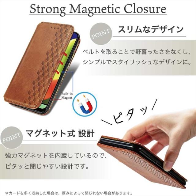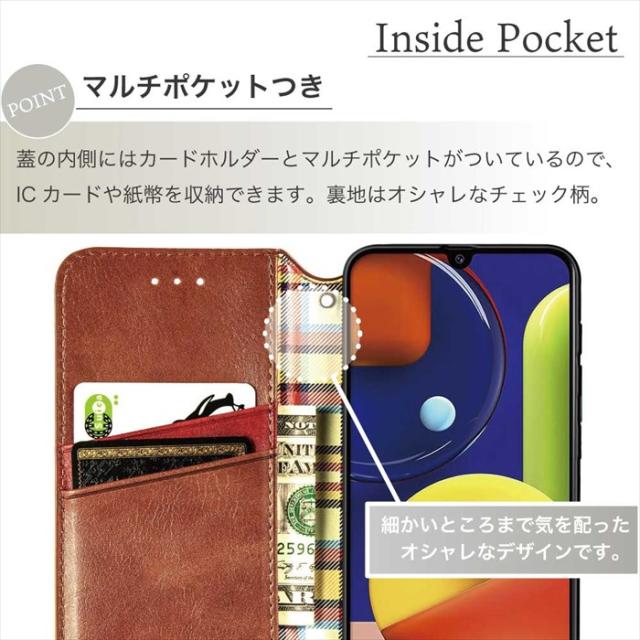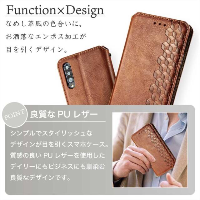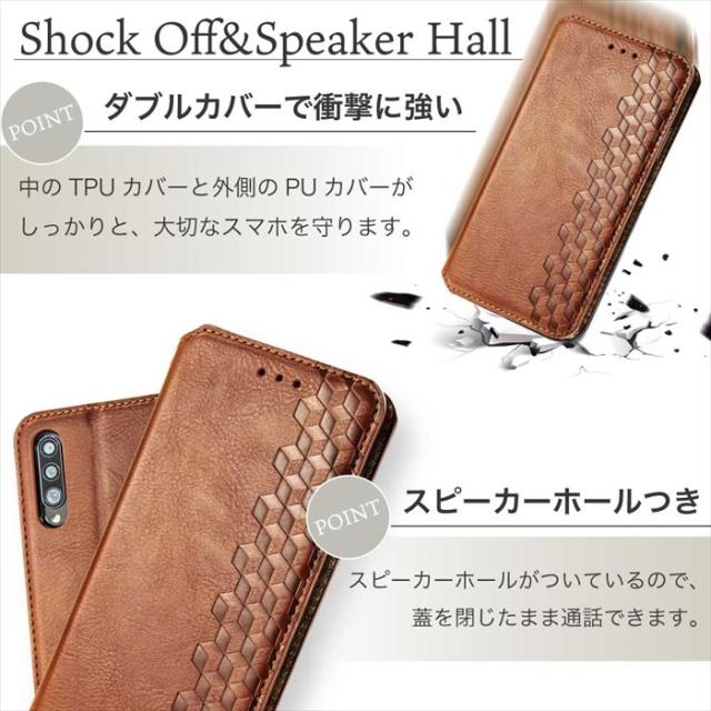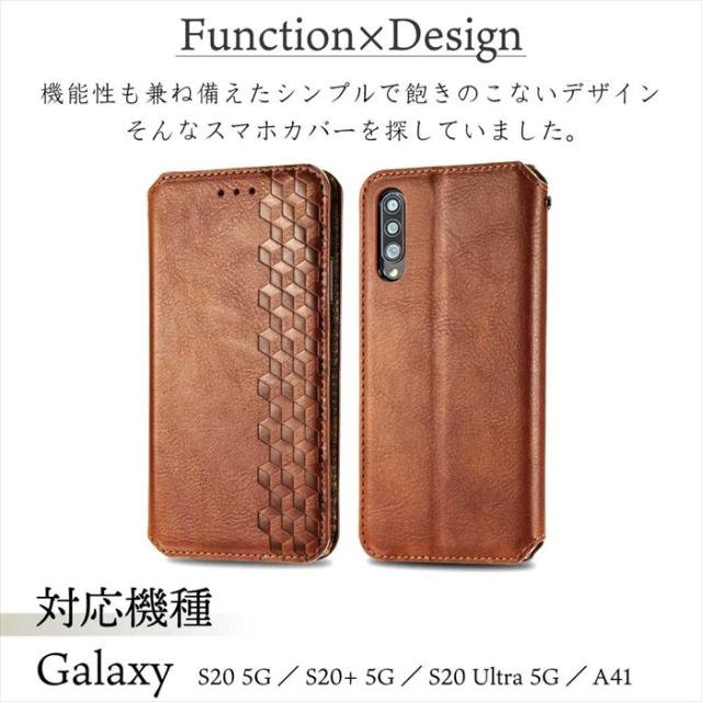 なめし革風の色合いに、お洒落なエンボス加工が目を引くデザインの手帳型スマホケースです。●シンプルでスタイリッシュなデザインで、質感の良いPUレザーを使用●デイリーにも、ビジネスにも馴染む良質なデザインです●強力マグネットを内蔵しているので、ピタッと閉じやすい設計です●中のTPUカバーと、外側のPUカバーのダブルカバーでしっかりと大切なスマホを守ります●スピーカーホールがついているので、蓋を閉じたまま通話可能●蓋の内側にはカードホルダーと、マルチポケットがついているので、ICカードや紙幣を収納可能●裏地はお洒落なチェック柄、細かい所まで気を配ったお洒落なデザイン●スタンド機能つきで、動画視聴などに便利●豊富なカラーバリエーションからお選びいただけます※商品画像にあるカメラ用ホールの位置は対応機種によって異なります。●カラー: 以下からご選択くださいネイビー / ブラック / グレー / グリーン / レッド / ブラウン●対応機種: 以下からご選択ください・Galaxy S20 5G・Galaxy S20+ 5G・Galaxy S20 Ultra 5G・Galaxy A41●素材: PUレザー、TPU