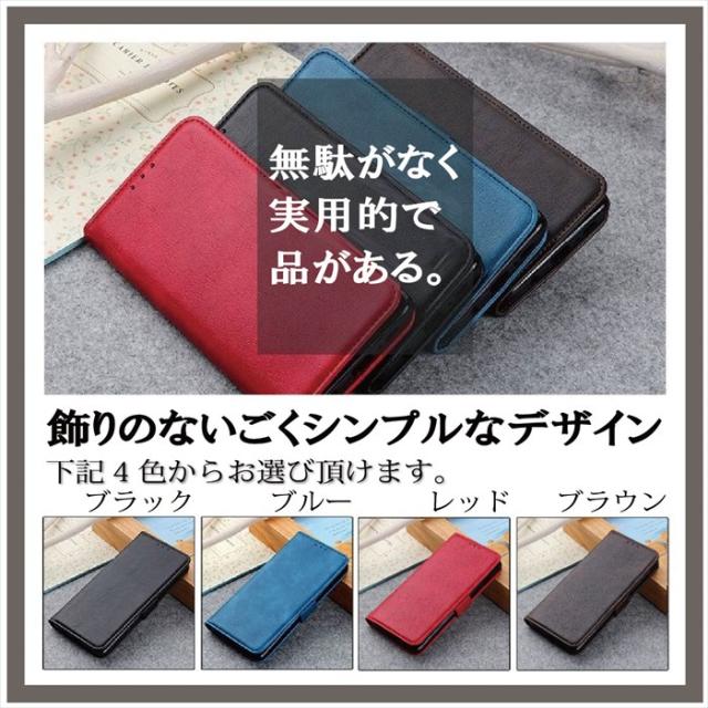 | 商品の説明 | 飾りや模様のないシンプルで品があるデザインがオシャレな手帳型スマホケース ●お好みに合わせて青・黒・赤・茶の4色バリエーションからお選び頂けます。 ●手帳型で多機能、カード収納、ポケット収納付き、横置き可 ●マグネット式でしっかり閉じ、前面ガラスまで完全に覆って保護 ●動画視聴などにとても便利なスタンド機能付き ●スピーカーホールがついているので、蓋を閉じたまま通話可能 |