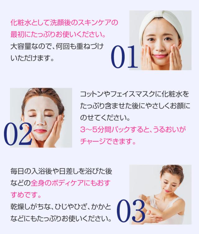 | ●こんな方にオススメです! ・しっかり潤う化粧水が使いたい。 ・夕方にお肌が乾燥しがちである。 ・お肌に弾力がなくなってきた気がする。 ・お風呂上がりの保湿ケアを時短したい。 ●温泉水※1と7種の保湿成分※2・28種の植物エキス※3配合で、お肌の角質層へ浸透し、ハリとうるおいのあるお肌へ導きます。 ※1 ※3 保湿成分 ※2:ヒアルロン酸Na、アセチルヒアルロン酸Na、加水分解ヒアルロン酸、水溶性コラーゲン、サクシノイルアテロコラーゲン、加水分解コラーゲン、プラセンタエキス ※3:ユキノシタエキス、ウコン根茎エキス、クマザサ葉エキス、ソメイヨシノ葉エキス、シソ葉エキス、シャクヤク根エキス、ウンシュウミカン果皮エキス、ライム果汁、オレンジ果汁、レモン果汁、グレープフルーツ果実エキス、サンザシエキス、ナツメ果実エキス、リンゴ果実エキス、ユズ果実エキス、ハトムギ種子エキス、ゲットウ葉エキス、オランダガラシ葉/茎エキス、ニンニク根エキス、アルニカ花エキス、ローズマリー葉エキス、ローマカミツレ花エキス、セイヨウキズタ葉/茎エキス、オドリコソウ花エキス、ゴボウ根エキス、セイヨウアカマツ球果エキス、チャ葉エキス、ウメ果実エキス ●コットンやティッシュに浸し、フェイスパックにも使え、 さらに全身の保湿ケアとしてもお使いいただけます。 ●お肌のことを考えた3つの無添加 合成香料フリー/合成着色剤フリー/鉱物油フリー ●使用方法:適量をコットン又は手のひらに取り、お肌になじませてください。 ●大容量なのでたっぷり色々使える! ●基本は化粧水として 洗顔後のスキンケアの最初にたっぷりお使いください。 大容量なので、何回も重ねづけいただけます。 ●コットンやフェイスマスクに化粧水をたっぷり含ませた後にやさしくお顔にのせてください。3〜5分間パックすると、うるおいがチャージできます。 ●毎日の入浴後や日差しを浴びた後などの全身のボディケアにもおすすめです。乾燥しがちな、ひじやひざ、かかとなどにもたっぷりお使いください。 |