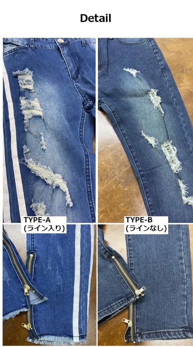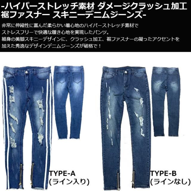 ■細身の美脚スキニーデザインに、クラッシュ加工、裾ファスナーの