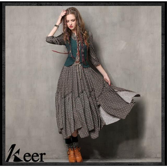 ワンピース レディース Aライン マキシ丈 七分袖 ドレス チュニック ヴィンテージ Liva girl