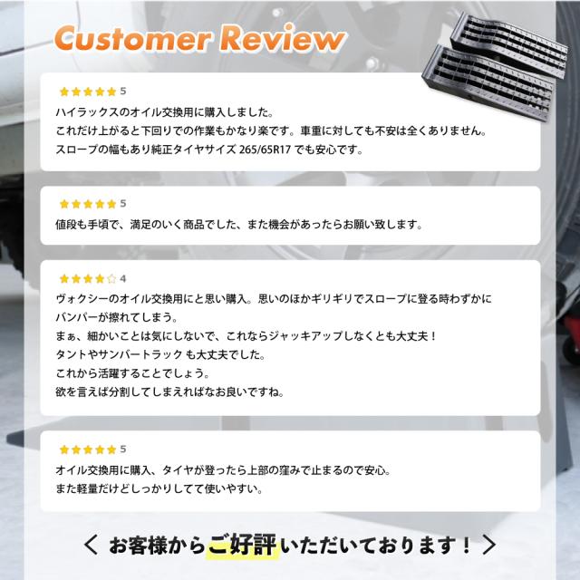 スロープの全高が高い!約160mmリフトアップします ●トップ部はラウンドした形状でタイヤが安定しやすい! ●前輪をのり上げることで簡易的に車輌をリフトアップできる、 カースロープ2個セットです ●タイヤを載せるだけで約160mmアップし、ジャッキアップの補助工具として使えます ●ホイール交換やオイル交換時、フロントスポイラーの脱着など、下回りの整備に活躍します ●ステップの表面は滑りにくい形状で、安定して車を載せられます ●上部に脱輪防止の車輪止めストッパー、本体の裏面6箇所にすべり止めのゴムが ついています ●軽量なので持ち運びにも便利です 《 こんな車におすすめ!》 ・ローダウン車、エアロパーツ車等、ジャッキアップしにくい車 ・アンダーカバー取り付けボルトの多い車 ・ドレンボルトがオイルパンの横についている車 ・アンダーメンバーが無い車で、ジャキアップポイントがエンジン後方にある車 ・ドレンボルトが無い車 【 ご注意 】 ※不安定な場所に設置して車で乗り上げた場合、破損することがございます ※必ず2個同時に使用してください ※車両バンパー形状や車高などにより、車両によってはご使用頂けない場合があります ※使用前には必ずタイヤ幅を確認してください また、耐荷重以上の重さをかけないでください ※本製品使用中に生じた破損・事故などについて責任は一切負いかねます 品番:CAS-4 |