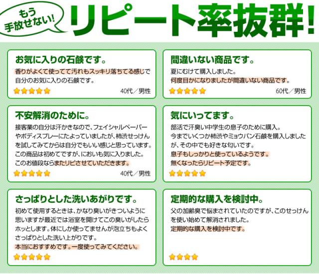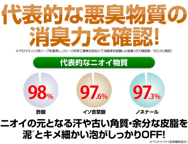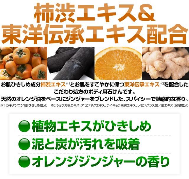 | ◆柿渋エキス&東洋伝承エキス配合! お肌ひきしめ成分、柿渋エキスとお肌をすこやかに保つ東洋伝承エキスを配合した、こだわり処方のボディ用石けんです。天然のオレンジ油をベースにジンジャーをブレンドした、スパイシーで魅惑的な香り。 ◆古い角質・汚れた皮脂をしっかり除去 ・泥&炭が洗浄を補助! ・汚れ除去でニオイOFF! ◆代表的な悪臭物質の消臭力を確認! |