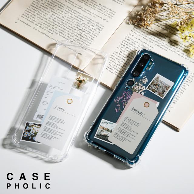 ドライフラワー、花や街並みの写真、大好きなお店のショッピングレシート。お気に入りをスクラップしたようなデザインをスマホケースにしました。