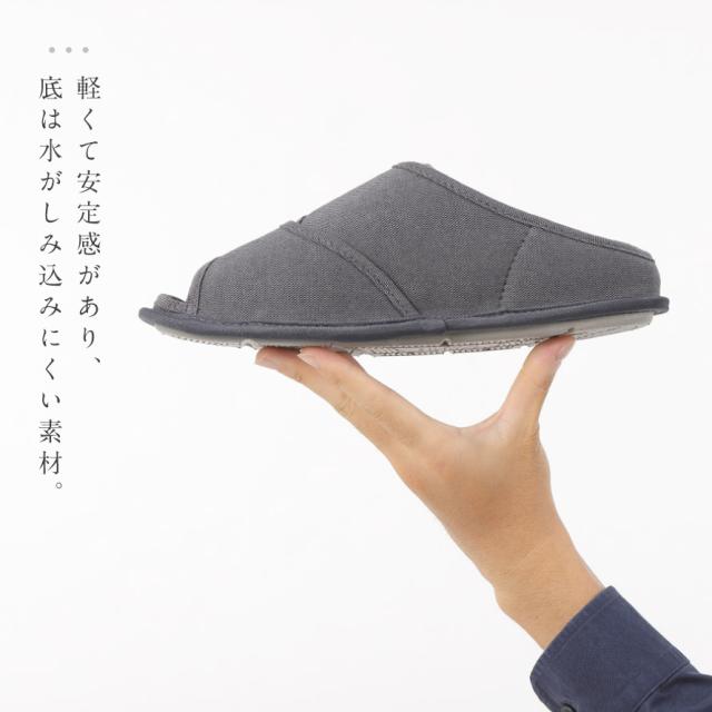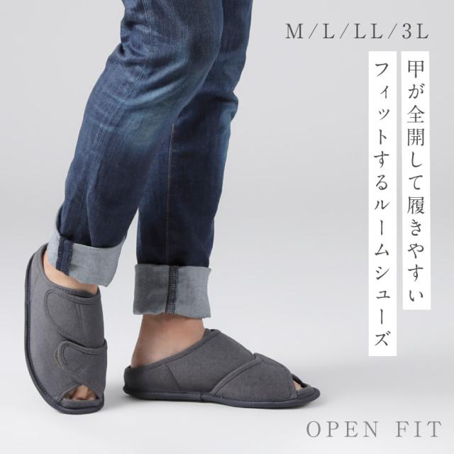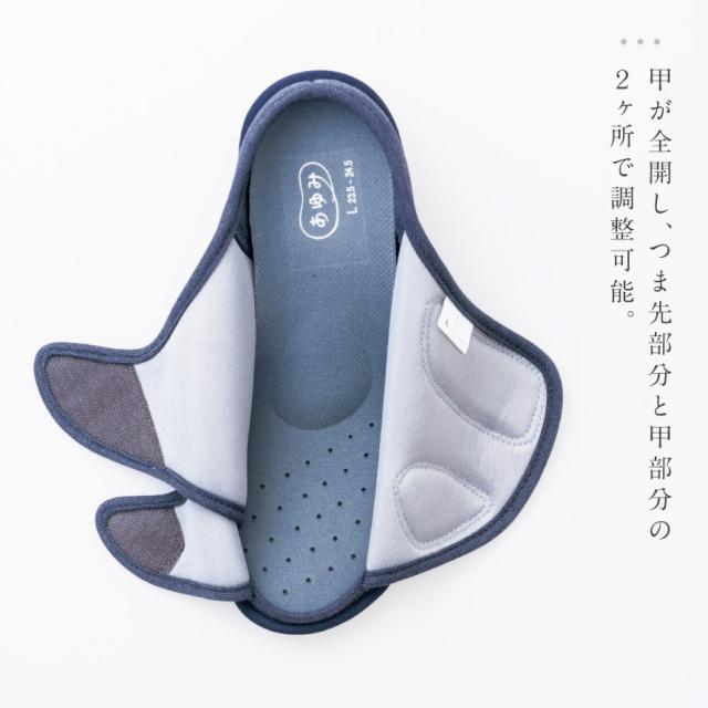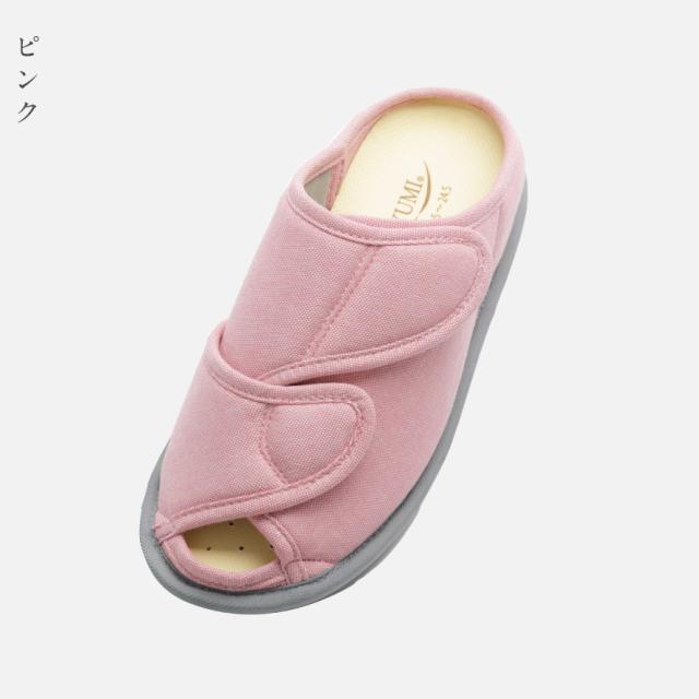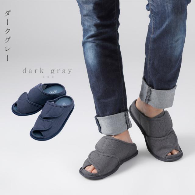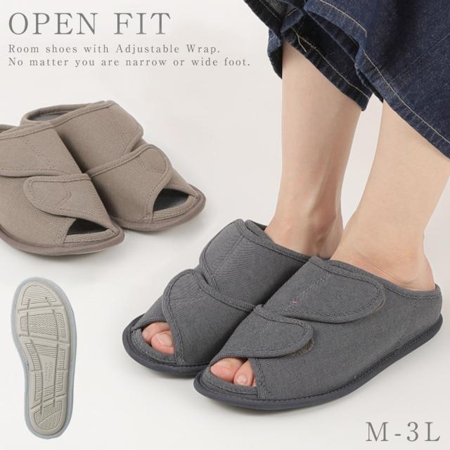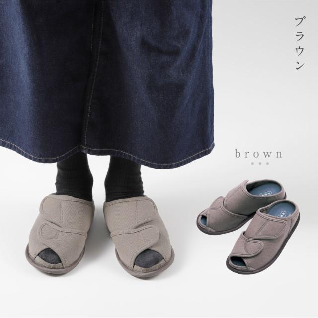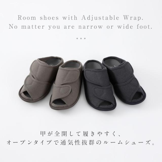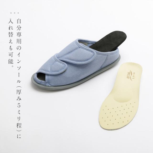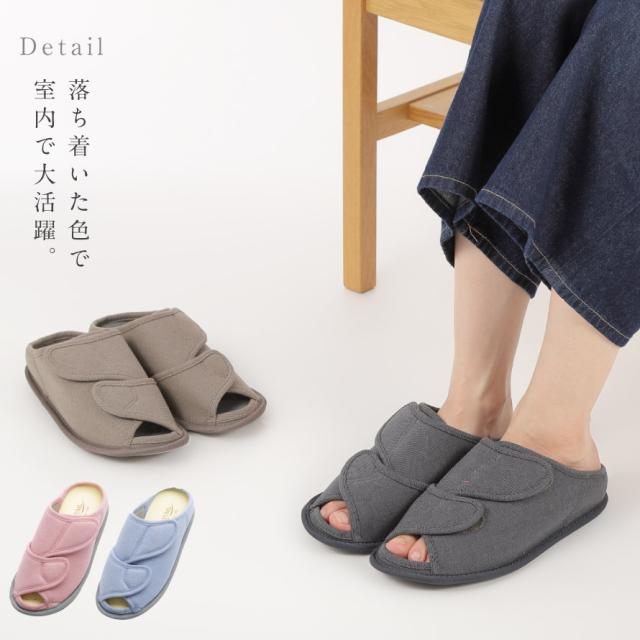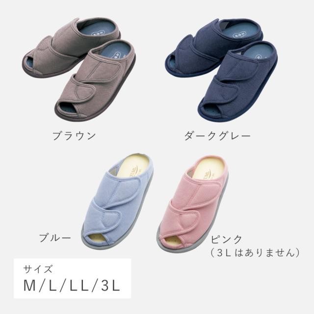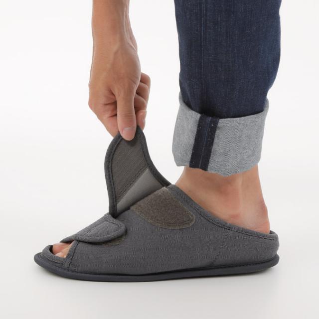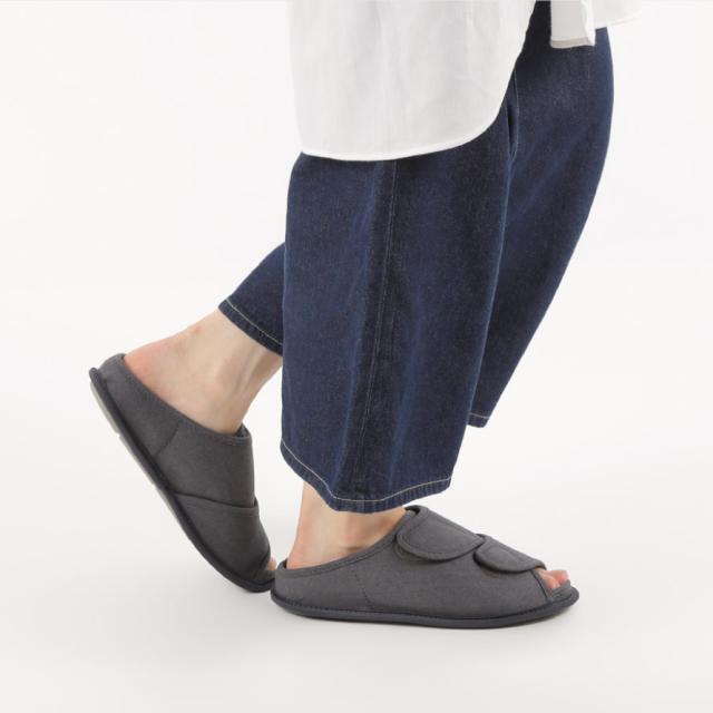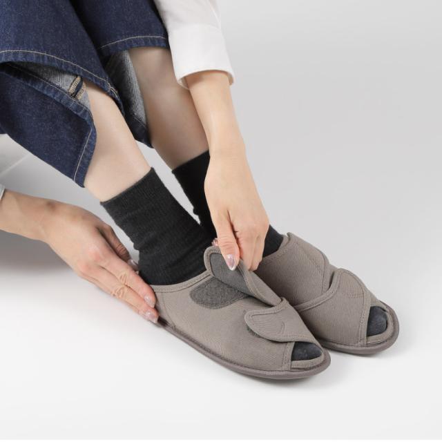 甲が全開して履きやすく、オープンタイプで通気性抜群のルームシューズ。つま先部分と甲部分の2ヶ所で調整可能なので、むくみのある方にもおすすめ。