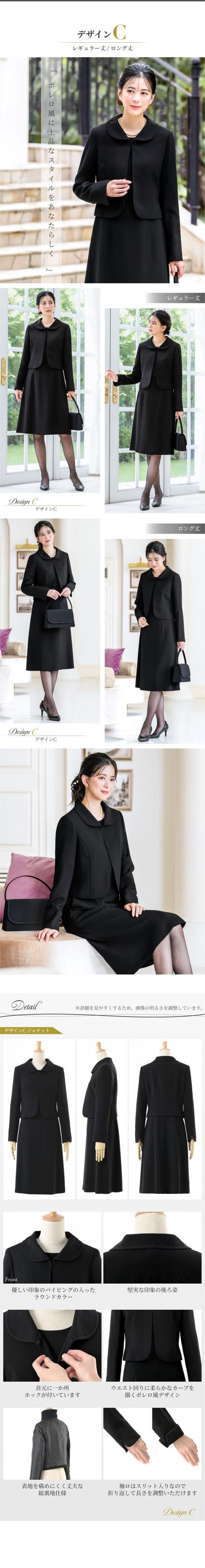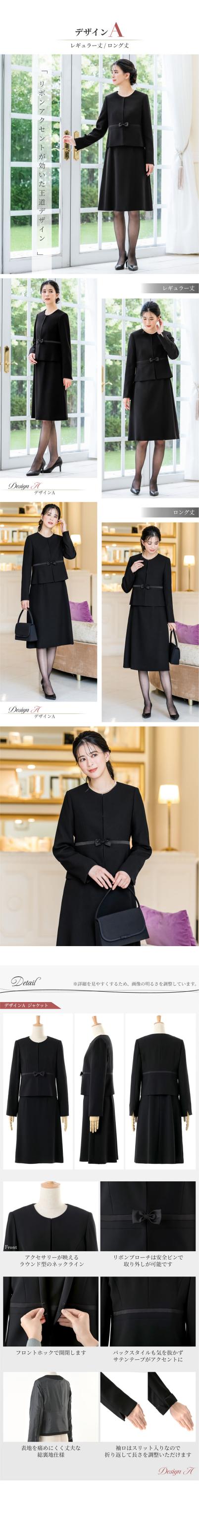 3デザインの中から、お好みのジャケットとワンピースの丈をレギュラー丈とロング丈の2種類から選ぶことができるこだわりの高級ブラックフォーマルスーツ。