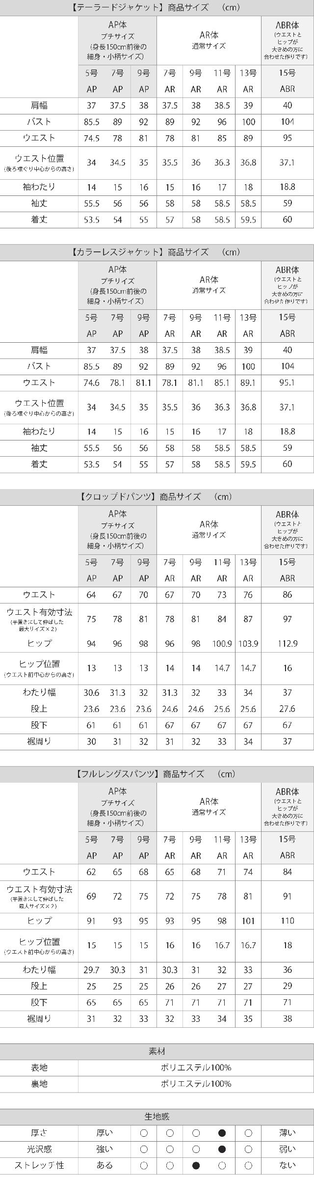 | テーラード カラーレス フルレングス クロップド 半裏 | |