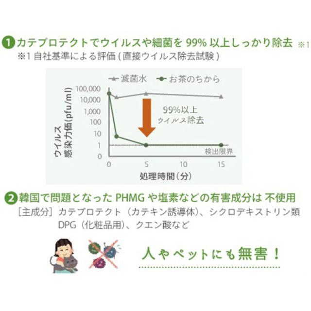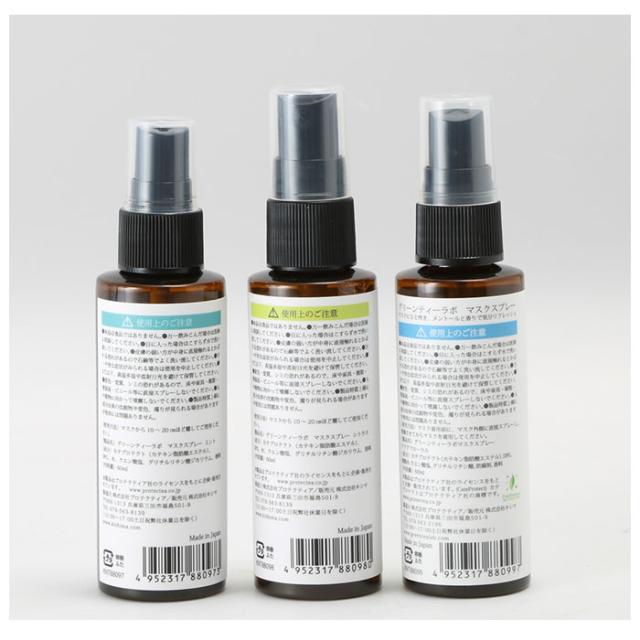 | 商品説明 | ・マスクにシュッシュッと簡単スプレー!フレッシュアロマの香りで手軽にウィルスブロック!グリーンティーラボの抗菌・抗ウィルスマスクスプレーが新登場。 ・感染症が気になる季節にマスクは必需品!長時間着用するマスクにも、サッとスプレーするだけで、除菌しながら爽やかな香りでリフレッシュ♪ ・マスクの外側にスプレーするだけで、ウィルスや細菌を99.9%除去。(※全てのウィルス・細菌に効果があるわけではありません。) ・抗菌・抗ウィルス効果のある成分「カテプロテクト」を配合。天然カテキン由来の成分で空気中のウィルスや細菌をしっかりと除去! ※大阪大学・産業科学研究所が共同開発した「カテプロテクト」は、天然カテキンの約40倍の抗菌・抗ウィルス活性を持つ新しいカテキン技術。 ・お茶由来の天然カテキンをベースにした成分だから、小さなお子さまやペットのいるご家庭でも安心。界面活性剤は使用せず、環境にもやさしい。 ・洗えるガーゼマスクはもちろん、使い捨ての不織布マスクにも使用可能。マスクがいつでも清潔に着用できる! ・1日1回、3プッシュで、爽やかな香りが1日中持続。たっぷり容量60mlだから、とっても経済的! ・ミント・シトラス・アクアフローラルなど、気分や季節に合わせて使える清々しい香りをラインナップ! |