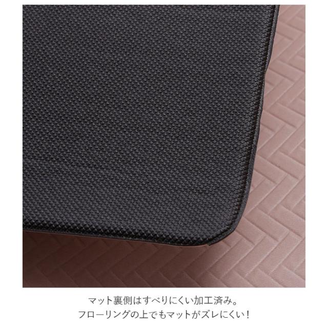 | 注意点 | ※マットは床のお掃除に使う洗剤、ワックス、水等をよく拭き取り、乾燥させてからご使用下さい。 ※長期間敷いたままでご使用されますと、床材が変色したり密着等することがあります。(特に新築の塩ビの床やワックス掛け後の床)週に2回程度は床面を拭いたり、取り外す等してご使用下さい。 ※マットに飛び乗ったり、床面が濡れていると滑る場合がありますので、ご注意ください。 ※マットに水・油類をこぼした場合には滑りやすくなりますので、ただちに拭き取ってください。 ※高温の物をマットの上に置かないでください。 ※洗剤や薬品を使ってお掃除する場合は、マットを取り外してください。 ※長時間直射日光が当たると、変色する場合があります。 ※素材特有のにおいがあります。気になる場合は風通しの良い場所で陰干ししてください。 ※本品は洗濯できません。 ※汚れた場合は固く絞った布で水拭きしてください。 ※汚れのひどい場合は、中性洗剤を含ませた布で拭き取り、最後に固く絞った布で水拭きをし、風通しのよい場所で陰干ししてください。 ※コーヒーや醤油など色の濃い物をこぼした場合は、すぐに拭き取ってください。時間が経つとシミになりとれなくなる場合があります。 ※カメラやモニターの性質により、画像と実物の色の違いがある場合がございますのでご理解願います。 |