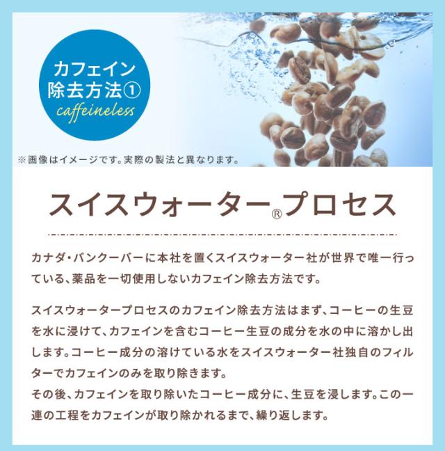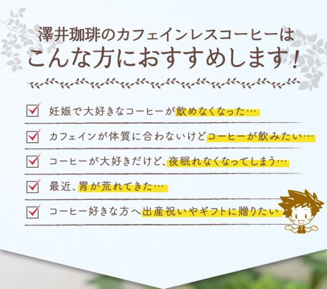 | こんな方にオススメです | 妊娠中や授乳中の方:「スイス・ウォータープロセス」という方法で化学薬品を使用せずにカフェインを97%以上カットしているため、安心して美味しいコーヒーを楽しめます。 プレゼント、贈り物として:カフェインカットで、妊婦さんやご高齢の方も安心して召し上がれますので贈答品やギフトにもぴったりです。 健康に気を遣っている方: カフェインの過剰摂取を避けたい方や、胃が荒れやすい方にもおすすめです。 |