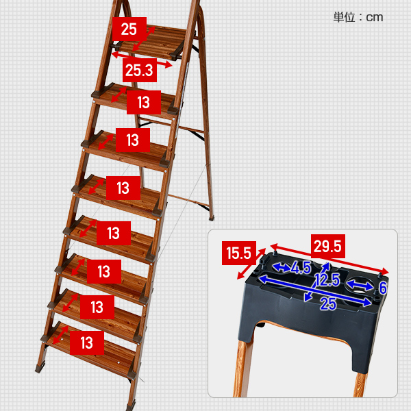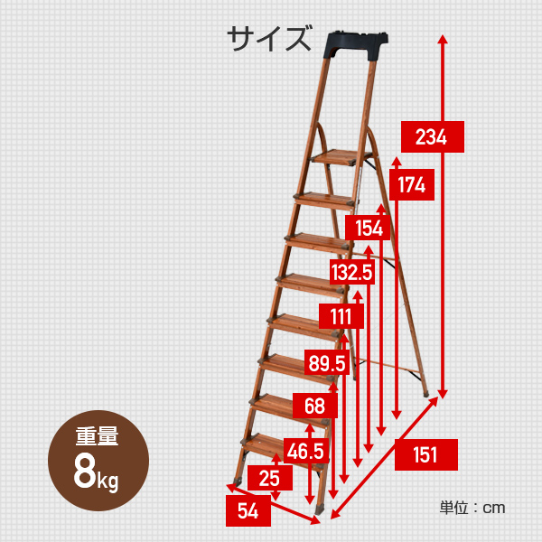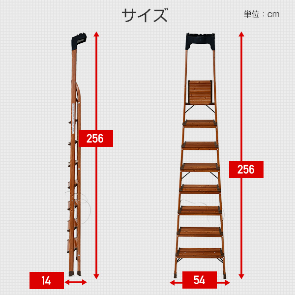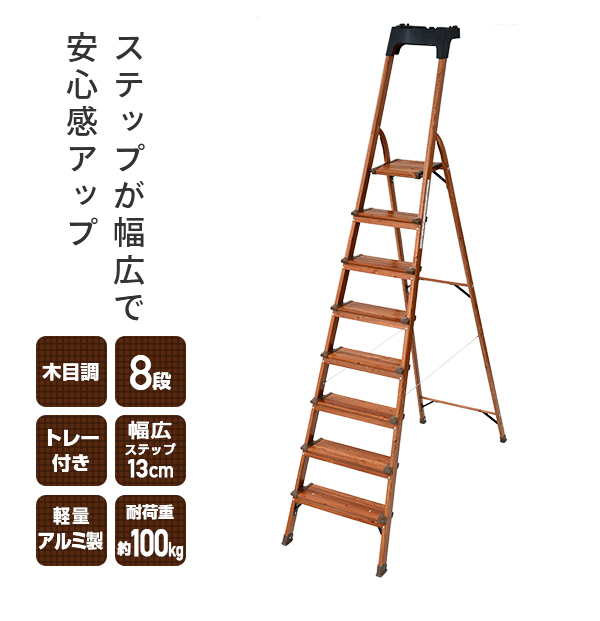 | 商品説明 | ●ステップ高さ:約25cm(1段目)、約46.5cm(2段目)、約68cm(3段目)、約89.5cm(4段目)、約111cm(5段目)、約132.5cm(6段目)、約154cm(7段目)、約174cm(8段目) ●折りたたみサイズ:幅54×奥行14×高さ256cm ●ステップ部の幅:13cm(1段目)、13cm(2段目)、13cm(3段目)、13cm(4段目)、13cm(5段目)、13cm(6段目)、13cm(7段目)、25cm(8段目) ●耐荷重:約100kg ●高い位置にある物を出し入れしたり、おうちに1台あると便利なトレー付き脚立 ●シーリングライトの取り付け、エアコンのフィルター交換、高いところにある窓のお掃除などに最適 ●ステップが13cmと幅広で安心感アップ ●折りたたみ時は幅約14cmの隙間にコンパクトに収納可能 ●掃除用品や工具類などを置いておける便利なトレー付き ●高いところも手すりフレームで安心 ●アルミ製で軽くて持ちやすい軽量タイプ ●安定性のある屋内でのご使用をお願いいたします |