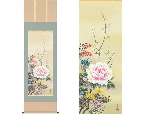 ★咲き競うように艶やかな四季の名花たちを一堂に描いた、四季を通じて典雅かつ艶やかな趣を味わっていただける人気の掛軸です。