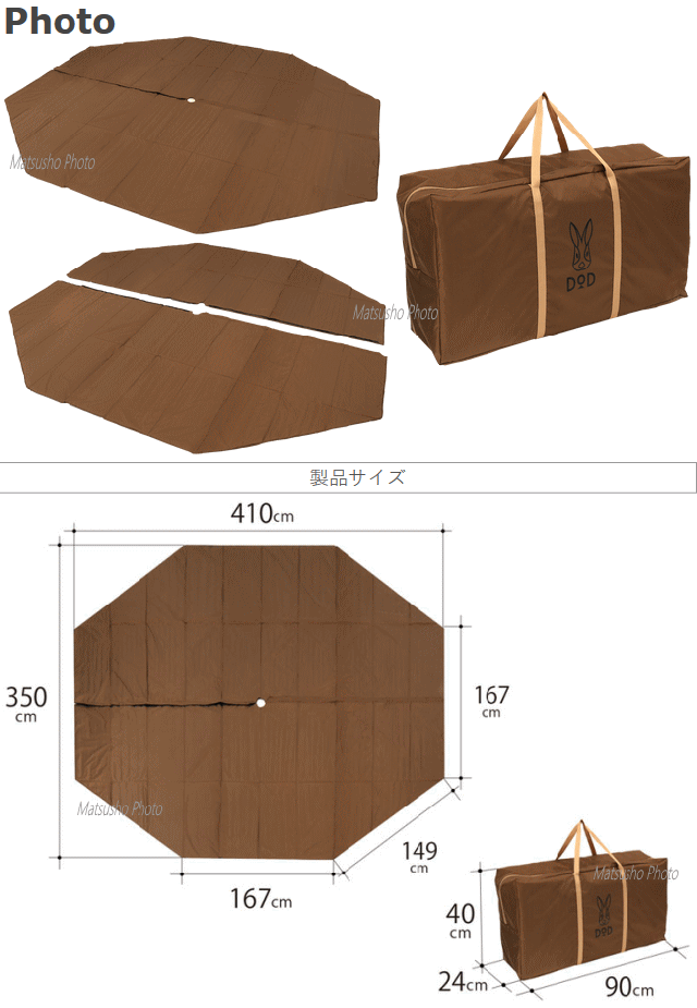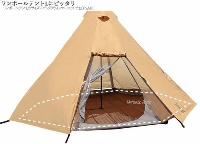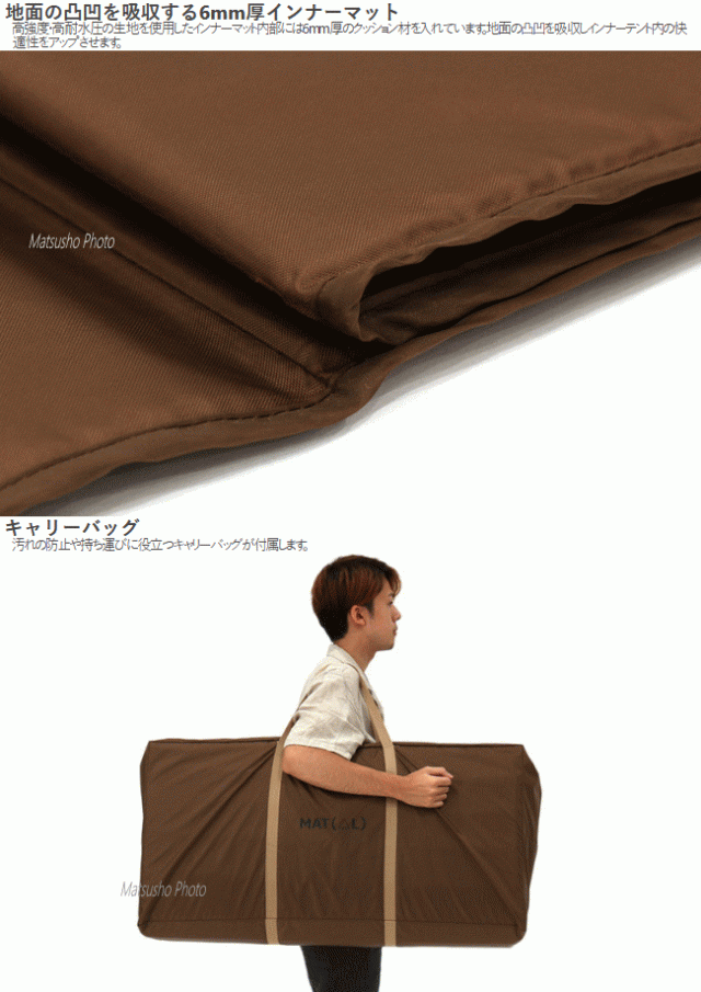ぴったりサイズでしっかりカバー。インナーテントが快適になるテントマット。テント内をさらに快適な空間にするワンポールテントLのサイズにピッタリのインナーマット。高強度・高耐水圧の生地を使用したインナーマット内部には6mm厚のクッション材を入れています。地面の凸凹を吸収しインナーテント内の快適性をアップさせます。また断熱効果もあり地面からの冷えを軽減します。汚れの防止や持ち運びに役立つキャリーバッグが付属します。■カラー:ブラウン■サイズ約W410×D350cm(長辺167cm・短辺149cm)■収納サイズ約W90×D24×H40cm■重量約4.7kg(付属品含む)■材質:210Dポリエステル(PUコーティング)、ポリエチレン■付属品:キャリーバッグ※代引&同梱&配達日時指定不可・北海道&沖縄&離島(中継)地域送付不可