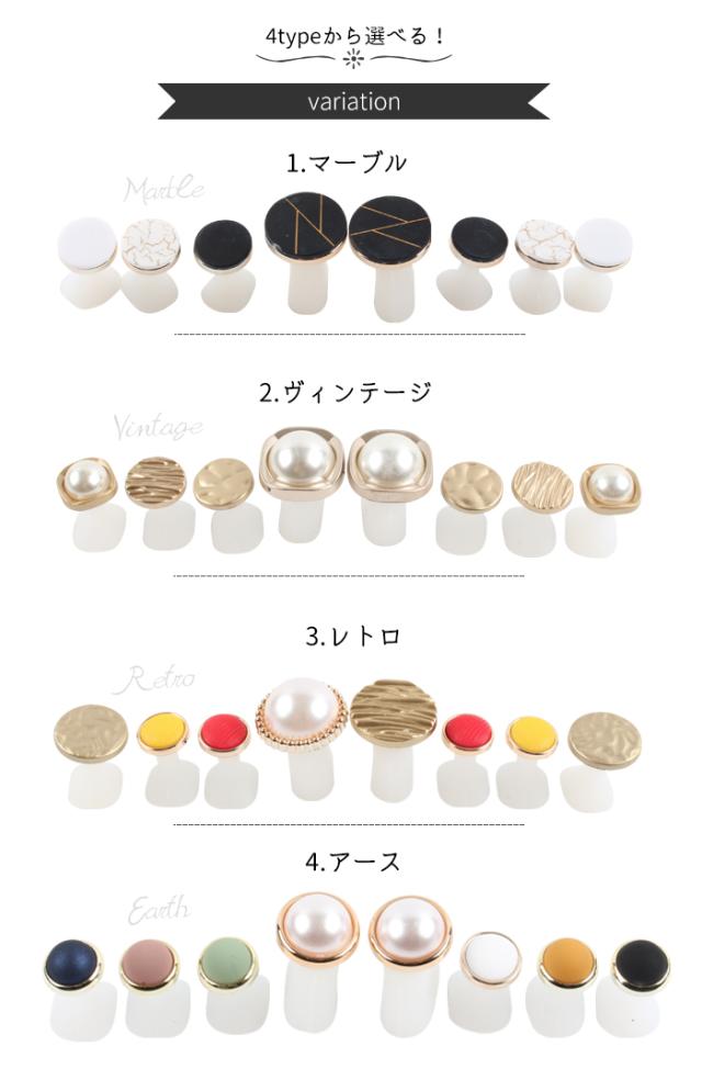 | 種類/サイズ | 【1】マーブル 【2】ヴィンテージ 【3】レトロ 【4】アース (大) 横約10mm×奥行き約19mm×高さ約21mm (小) 横約13mm×奥行き約15mm×高さ約17mm |