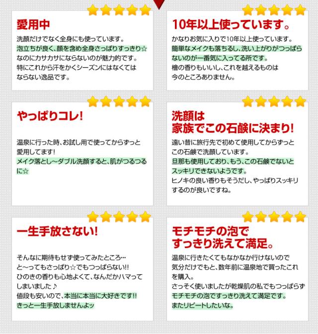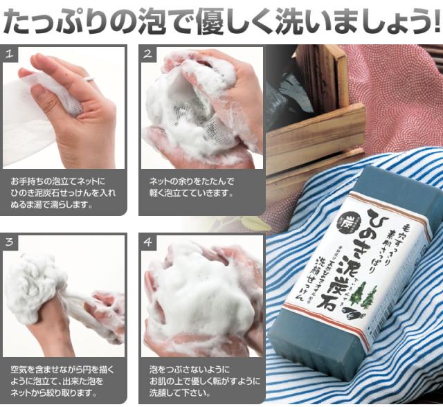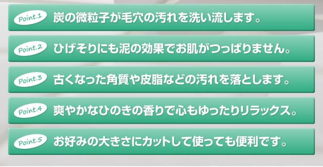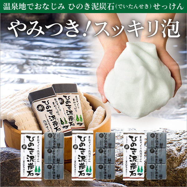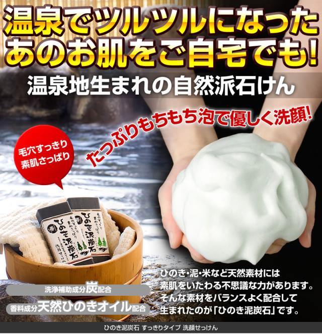 | ・温泉施設など、口コミで大人気!お肌に負担をかけずに優しく洗い上げる! ・ひのき×炭×泥がお肌をいたわりながら、汚れをしっかりかき出す! ・定番の大人気シリーズ。 ・泥と炭が毛穴の汚れを奥からかき出し、すっきり洗い上げます。 ・軽いメイクならこれだけでOK。 ・ひのきの香りで心のリラックスを促し、気分はまさに森林浴! ・洗浄成分植物性原料使用 ・「ひのき泥炭石」は、香料成分として天然ひのきから抽出した、良質なひのきオイルを配合しています。 ○天然ヒノキオイル配合(香料成分) …ほのかな自然の香りをお楽しみいただけます。 ○泥/ベントナイト配合(保湿成分) …泥成分に含まれるミネラル分がお肌にハリを与えます。 ○炭配合(洗浄補助成分) …炭の微粒子が毛穴の汚れを洗い流し、お肌のキメを整えます。 ○パパイン配合(洗浄補助成分) |
