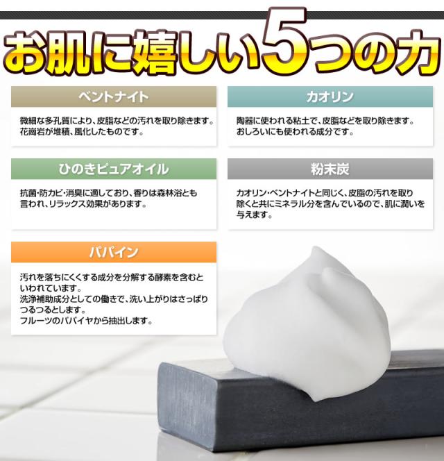 成分/石ケン素地・水・香料・カオリン・ベントナイト・EDTA-4Na・エチドロン酸4Na・グリセリン・炭・パパイン・塩化Na・デキストリン