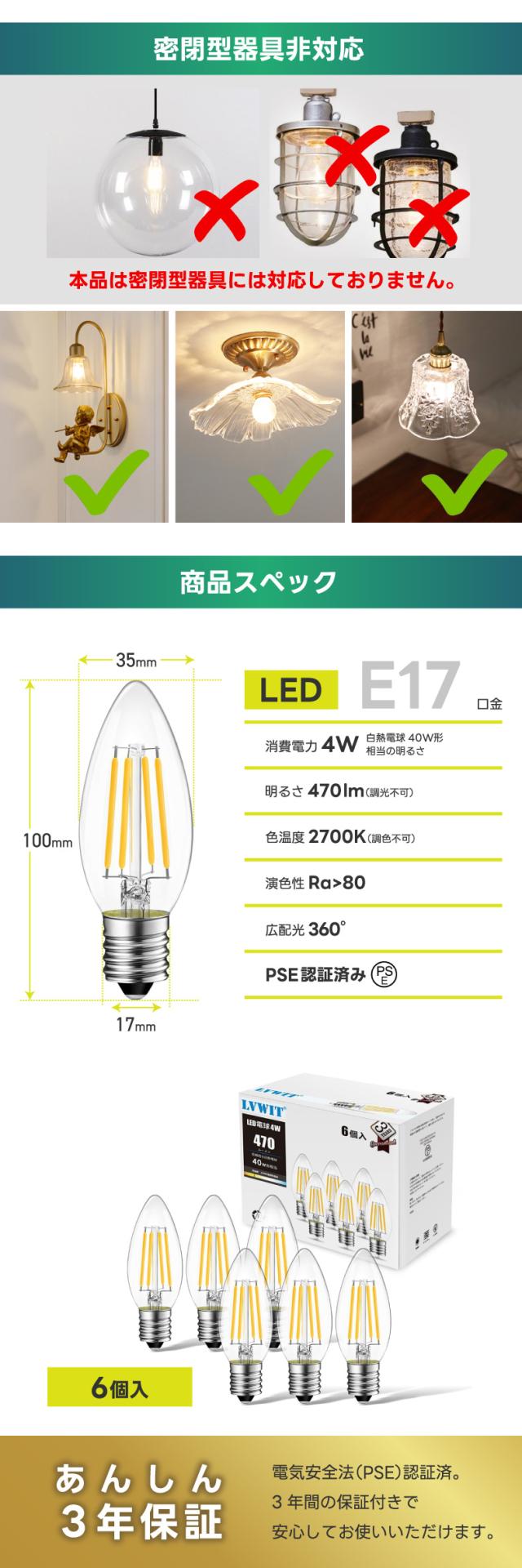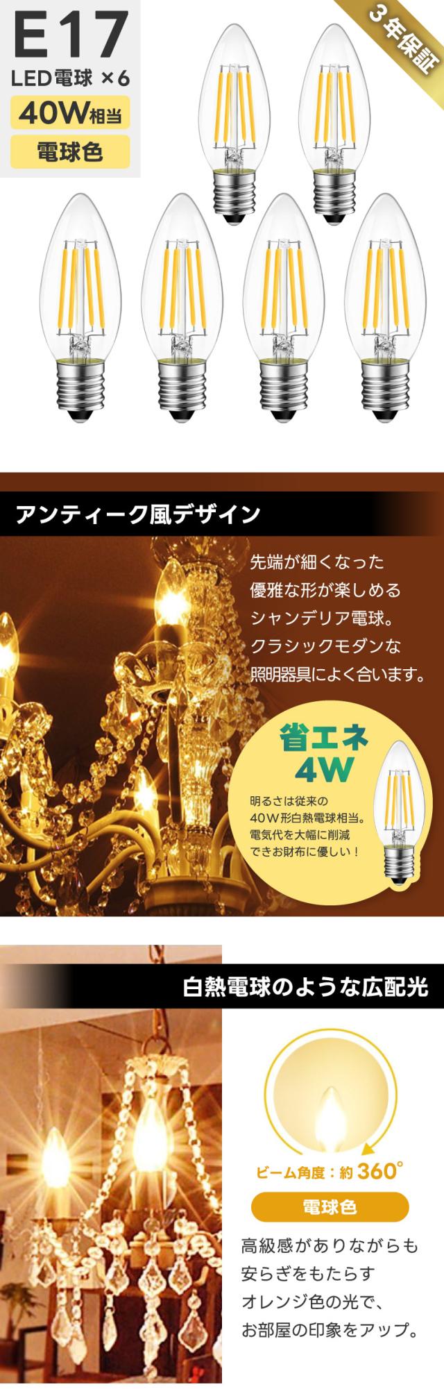 | 商品説明 | LED電球 シャンデリア電球 E17口金 40W形相当 470LM 2700K電球色 LED C35 フィラメント電球 広配光 省エネ 4W 蝋燭型 レトロ電球 PSE認証 6個セット 調光器非対応 |