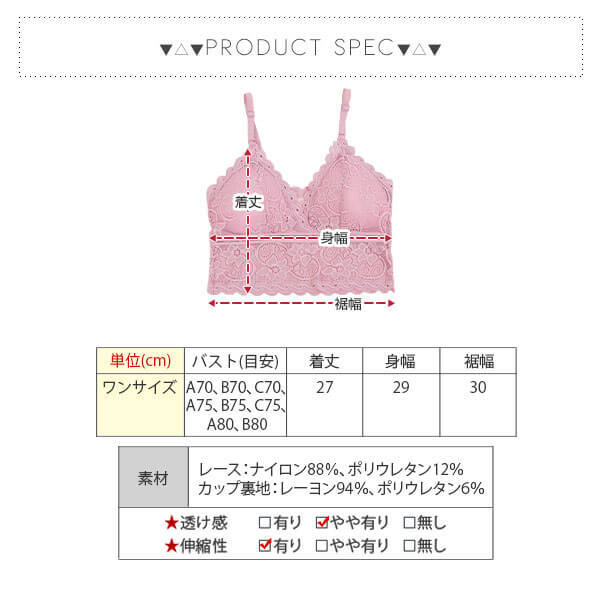 素材 レース:ナイロン88%,ポリウレタン12% カップ裏地:レーヨン94%,ポリウレタン6%