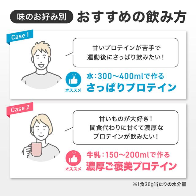 シェーカーやミキサーなどに、水もしくは牛乳150?250ml程度を目安にお好みを量を入れ、その後に、プロテインを約30gを目安に入れてください。お使いのプロテインシェイカーのフタをしっかりと閉め、10秒ほどシェイク又はミキシングをしてから、お召し上がりください。