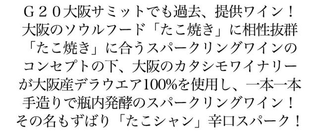 日本ワイン愛好家大注目!大阪柏原市産デラウェア種100%辛口スパークリングワイン!大阪のカタシモワイナリーが大阪産デラウエアを使い、大阪のソウルフード「たこ焼き」に合うスパークリングワインのコンセプトの下にをつくり上げたのが、これ!「気軽に本格スパークリングワインを楽しんでいただきたい!」との思いで、大阪のぶどう農家とカモシタワイナリーが、力を合わせてデラウェア種100%で1本1本手造りで瓶内発酵のスパークリングワインを造りました!(ちなみに大阪はデラウェア種の生産全国第3位)しかもG20大阪サミットでも提供ワイン!フルーティーでフレッシュな柑橘系の香りが広がります!合う料理:たこ焼き、飲み頃温度:4〜8度!ずばり“たこシャン”が遂に登場!