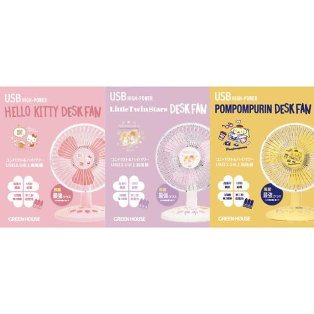 大人気のサンリオキャラクターとコラボした卓上用USB扇風機です。オフィスや自宅のデスクで、可愛く涼しく癒します。USB接続の強力デスク用扇風機。※本体から10cmの位置で測定。上部のつまみを回すことで、広範囲に風を送れる自動首振り機能をONにできます。ファンを上下させることにより手動で風向を調整することができます。本体のスイッチで風力を3段階で調整することができます。単3形アルカリ乾電池3本でも使用可能。※連続稼動時間約60分(弱)。カラーバリエーションは、ハローキティ(JAN:4511677114687/品番:GH-FANSWH-KT)、リトルツインスターズ(JAN:4511677114694/品番:GH-FANSWH-TS)、ポムポムプリン(JAN:4511677114700/品番:GH-FANSWH-PN)です。