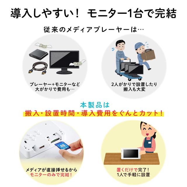 ●店頭での販促に最適な電子POPモニターです。●SDカードに保存した動画、静止画、音楽を再生できます。