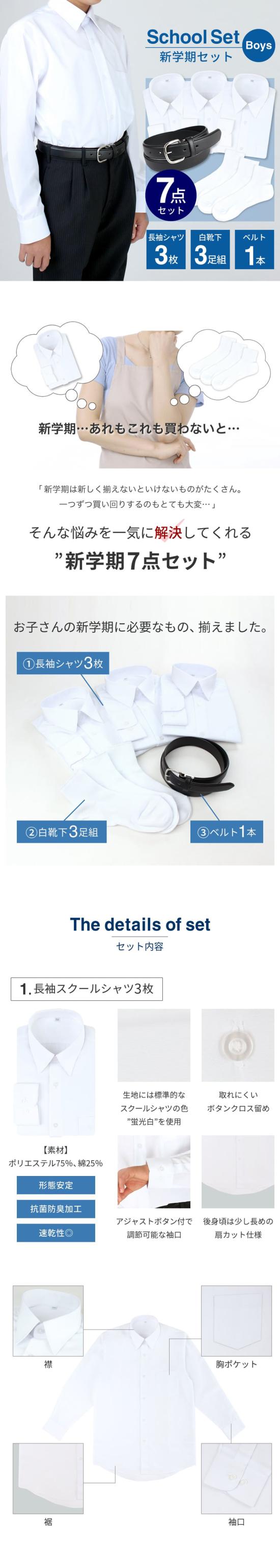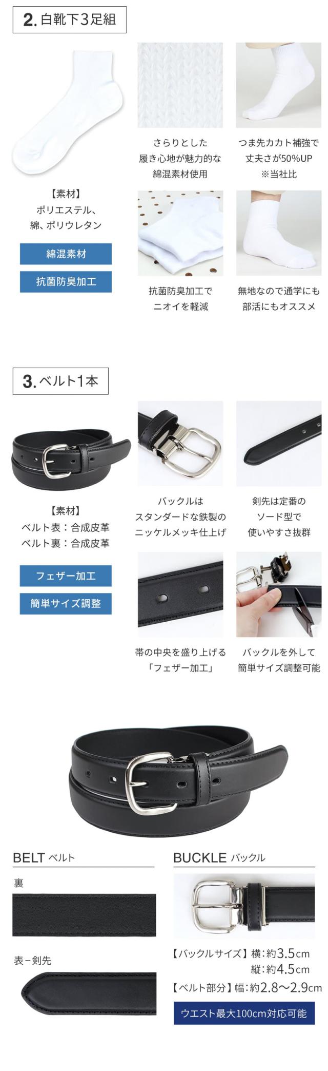 長袖スクールシャツ3枚+白靴下3足組+ベルト1本