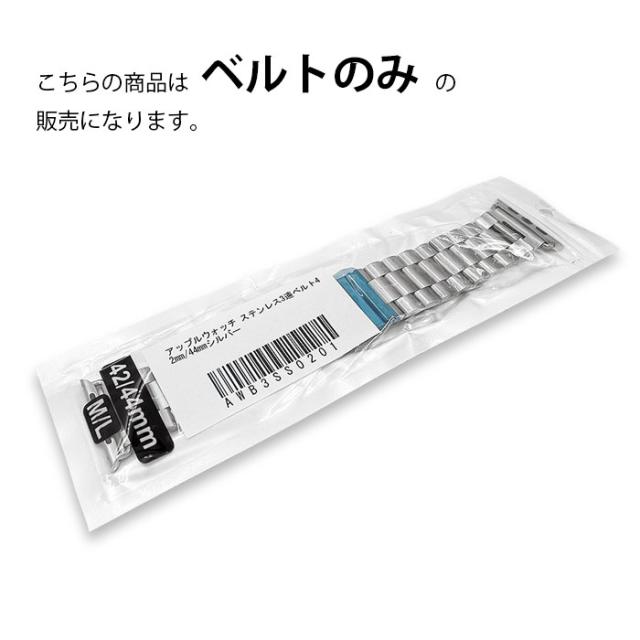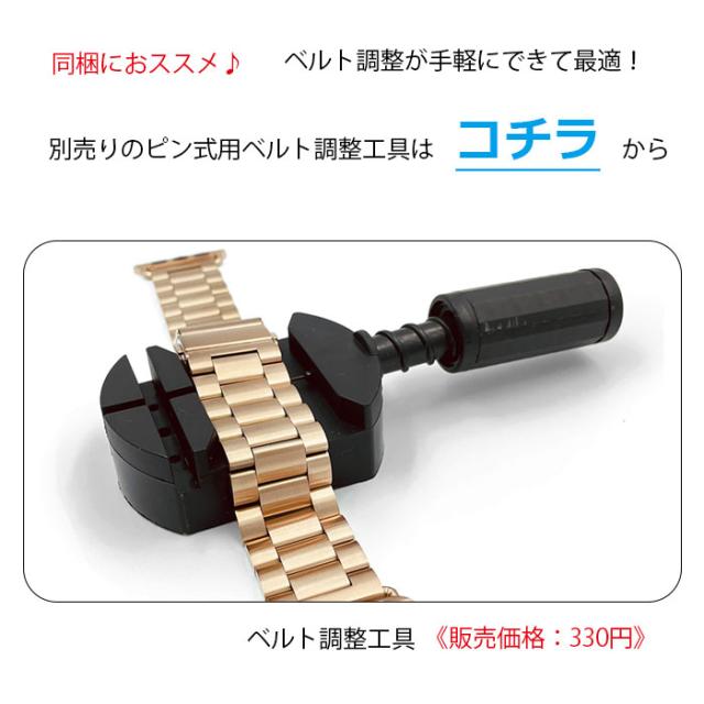 Apple Watchの着せ替えバンドから高品質なステンレス製の3連ベルトが登場です。 ソリッドな質感でビジネスシーンにぴったりなメタルブレスレット。 きちっとした印象で、スーツにも私服にも合わせやすいのが特徴です。 ステンレス製なので重量感があり、キズが付きやすいのが注意点ですが レザーとは違いキズは研磨クロスなどで磨いてメンテできます。 汗や水が付着してもクロスで拭き手入れを欠かさなければ、レザーのように 痛んでくることはありません。 またアップルウォッチ用のラグも付いていて、ベルト調整用の工具もセットになっています。 商品が届いてスグにベルト調整が出来るので時計店に持ち込んで ベルト調整をする必要もありません。 またギフトボックスに入っているからプレゼントにも最適です。