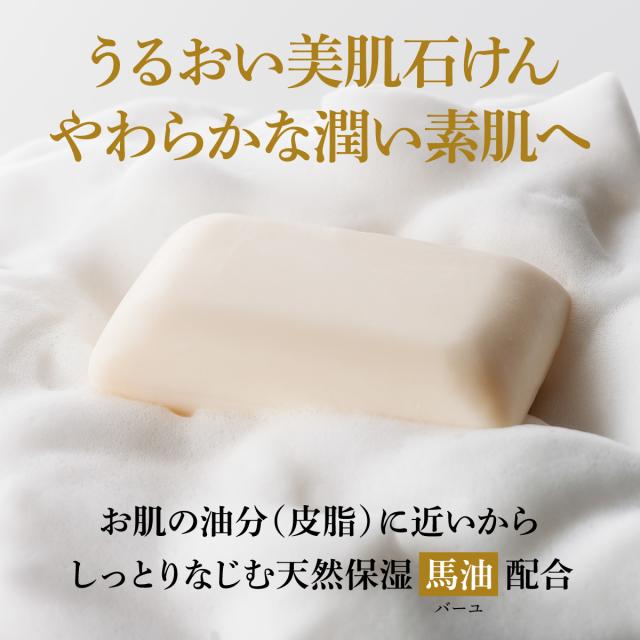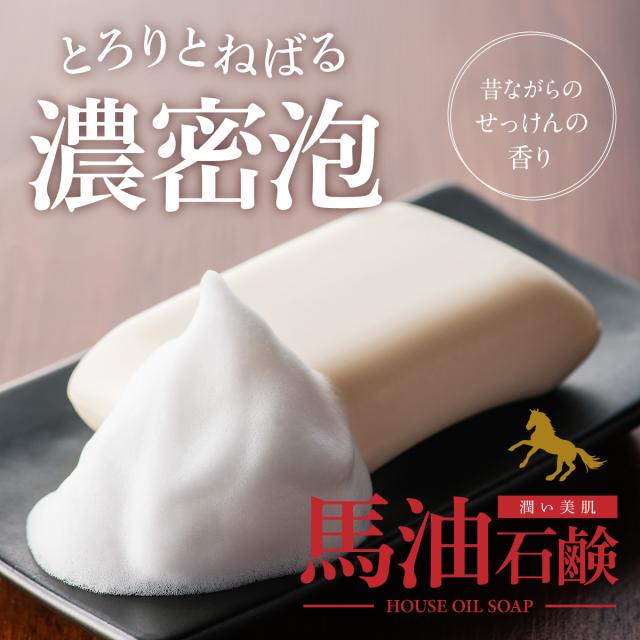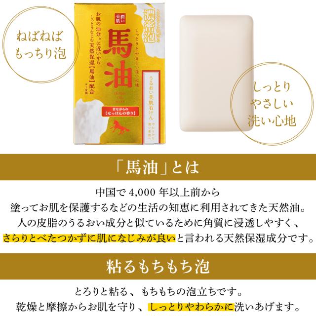 | ○「馬油」とは 中国で4,000年以上前から、塗ってお肌を保護するなどの生活の知恵に利用されてきた天然油。 人の皮脂のうるおい成分と似ているために角質に浸透しやすく、さらりとべたつかずに肌になじみが良いと言われる天然保湿成分です。 ○粘るもちもち泡 とろりと粘る、もちもちの泡立ちです。 乾燥と摩擦からお肌を守り、しっとりやわらかに洗いあげます。 【とろりとねばる濃密泡】【うるおい美肌石けん】【しっとりとやさしい洗い心地】【昔ながらのせっけんの香り】【お肌の油分(皮脂)に近いからしっとりなじむ天然保湿馬油配合】 |