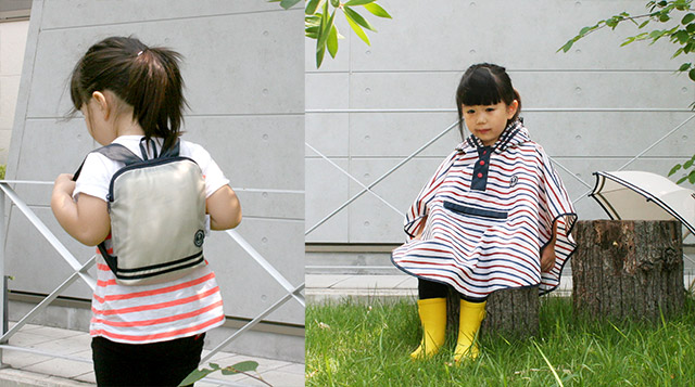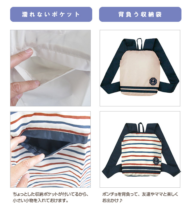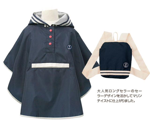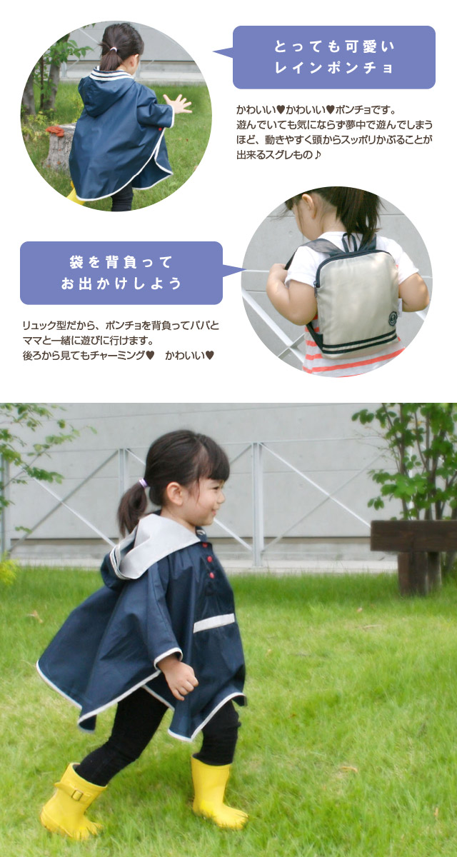 可愛いキッズ用のマリンレインポンチョ。背中にポンチョを背負ってお出掛け。 |