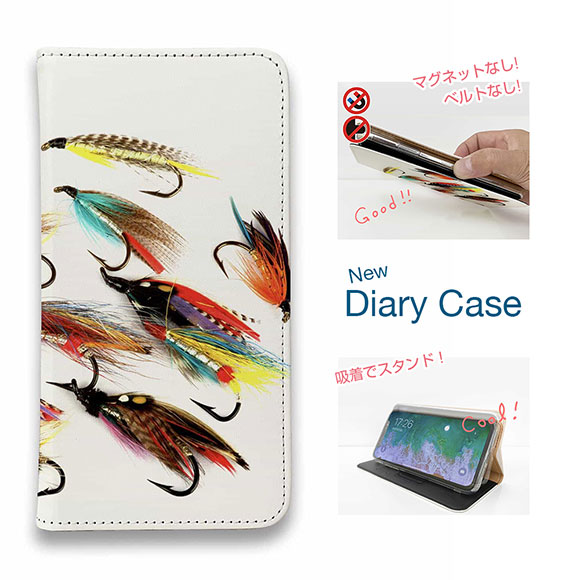 スマホケース 手帳型 ベルトなし マグネットなし iPhone17 Pro Max iPhone Air iPhone16e Pro Max 16 Plus 15 Pro Max 14 Plus Xperia 10 VII Galaxy AQUOS Pixel10 Pro XL 釣り 魚 ルアー フライのデザイン