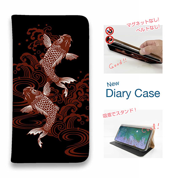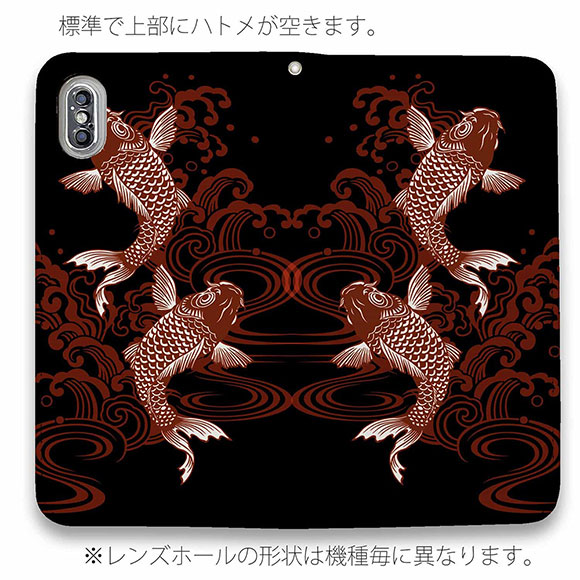 スマホケース 手帳型 ベルトなし マグネットなし iPhone17 Pro Max iPhone Air iPhone16e Pro Max 16 Plus 15 Pro Max 14 Plus Xperia 10 VII Galaxy AQUOS Pixel10 Pro XL 釣り 魚 ルアー タトゥー風昇り鯉 レッド&ブラック
