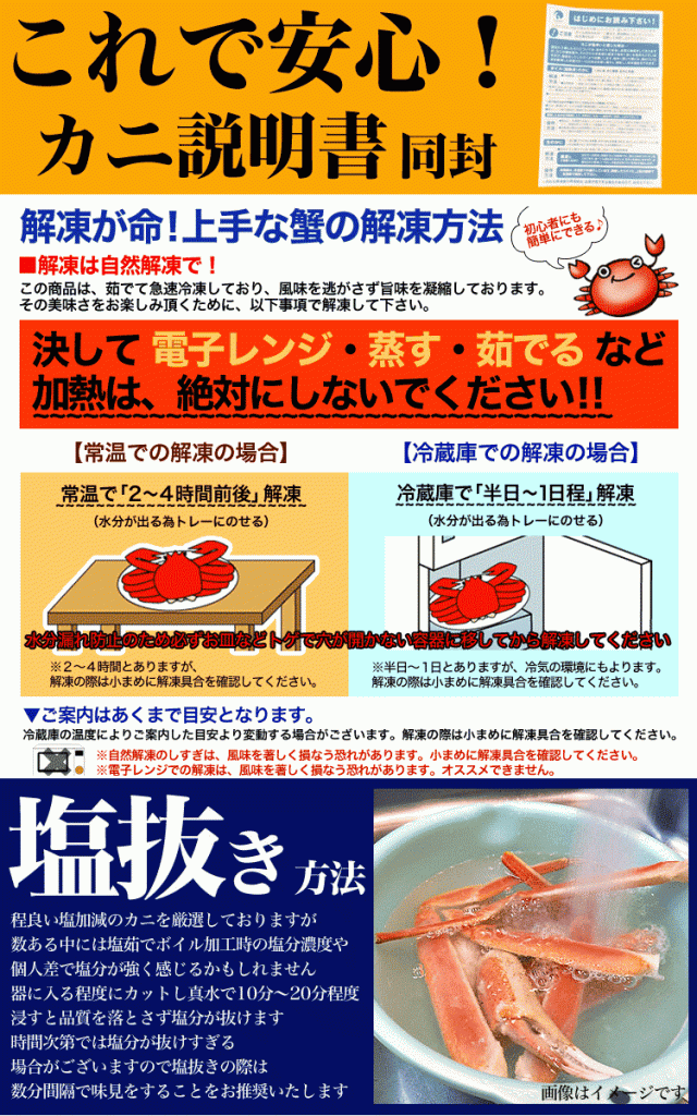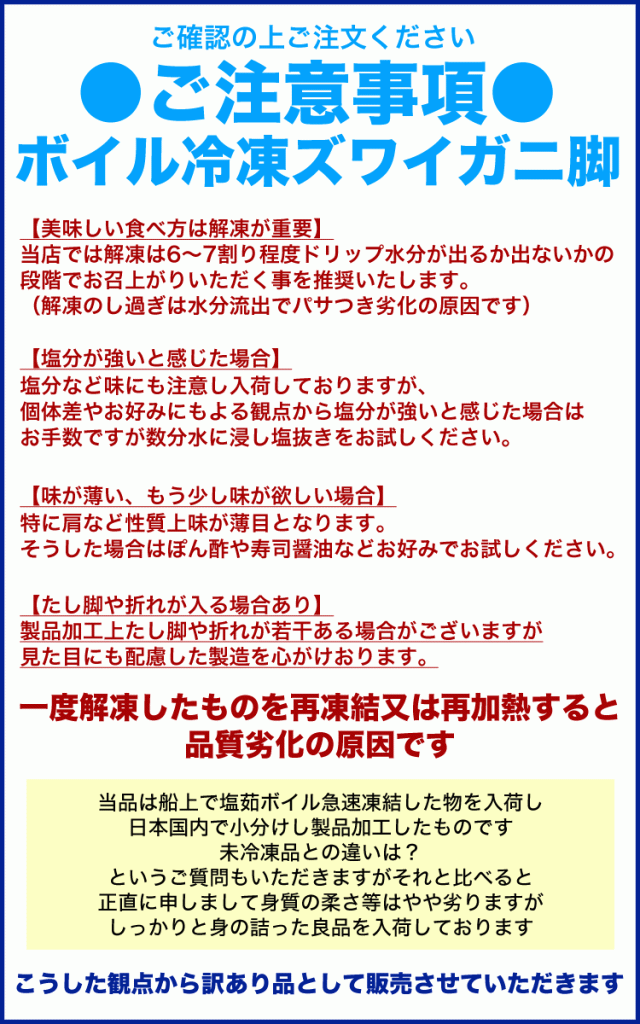 堅ガニ(上質)の性質上脱皮後しばらく時間が経過した関係もあり傷やフジツボや海藻等の付着物がある場合がありボイル加熱でドリップの固まりや肩付近に若干の味噌の付着が黒ずみ汚れに見える場合がございますが商品の性質上ですのでご安心ください。重量調整の関係で足パーツ組み合わせ次第で爪等が入らない場合がございます。