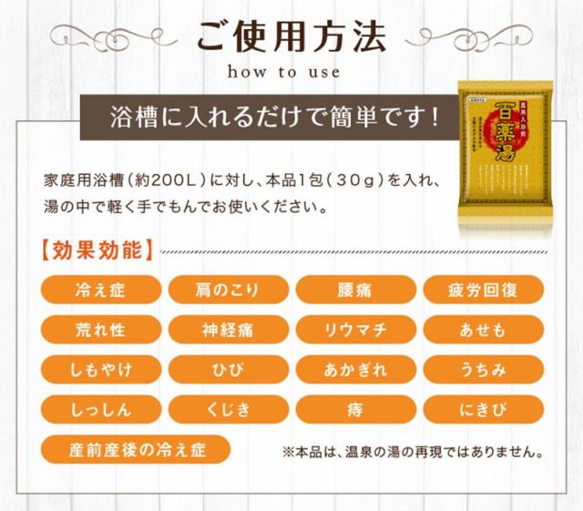 | ご使用方法 | 家庭用浴槽(約200L)に対し、本品1包(30g)を入れ、湯の中で軽く手でもんでお使いください。 |