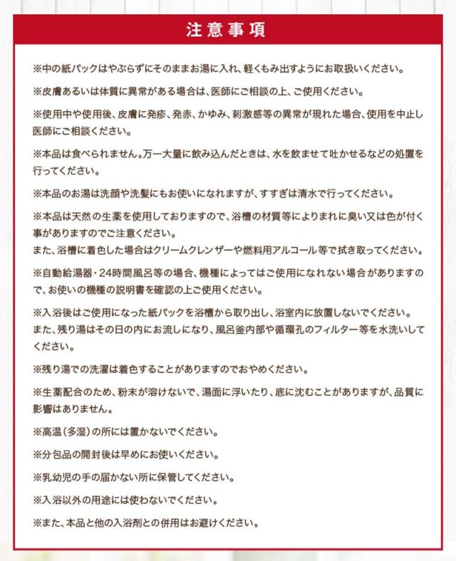 | 使用上のご注意 | ・中の紙パックはやぶらずにそのままお湯に入れ、軽くもみ出すようにお取扱いください。 ・皮膚あるいは体質に異常がある場合は、医師にご相談の上、ご使用ください。 ・使用中や使用後、皮膚に発疹、発赤、かゆみ、刺激感等の異常が現れた場合、使用を中止し医師にご相談ください。 ・本品は食べられません。万一大量に飲み込んだときは、水を飲ませて吐かせるなどの処置を行ってください。 ・本品のお湯は洗顔や洗髪にもお使いになれますが、すすぎは清水で行ってください。 ・本品は天然の生薬を使用しておりますので、浴槽の材質等によりまれに臭い又は色が付く事がありますのでご注意ください。また、浴槽に着色した場合はクリームクレンザーや燃料用アルコール等で拭き取ってください。 ・自動給湯器・24時間風呂等の場合、機種によってはご使用になれない場合がありますので、お使いの機種の説明書を確認の上ご使用ください。 ・入浴後はご使用になった紙パックを浴槽から取り出し、浴室内に放置しないでください。また、残り湯はその日の内にお流しになり、風呂釜内部や循環孔のフィルター等を水洗いしてください。 ・残り湯での洗濯は着色することがありますのでおやめください。 ・生薬配合のため、粉末が溶けないで、湯面に浮いたり、底に沈むことがありますが、品質に影響はありません。 ・高温(多湿)の所には置かないでください。 ・分包品の開封後は早めにお使いください。 ・乳幼児の手の届かない所に保管してください。 ・入浴以外の用途には使わないでください。また、本品と他の入浴剤との併用はお避けください。 |