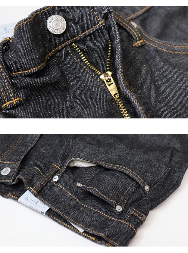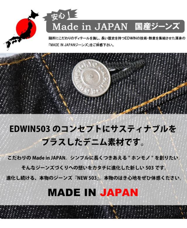 【素材】 経糸は三本精紡交撚糸を使用し、毛羽の無く光沢のある濃色インディゴ染を採用、緯糸にはEDWINジーンズの生産工程で出される「裁断クズ」やお客様から回収された不要になったジーンズを反毛し作られたオリジナルのストレッチ糸採用しました。EDWIN503のコンセプトにサスティナブルをプラスしたデニム素材です。