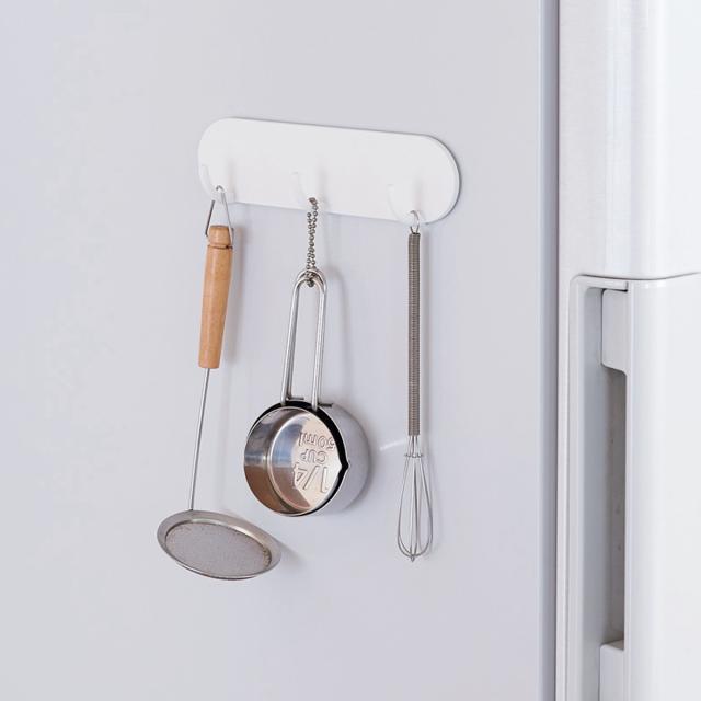 ●キッチンツールやお掃除道具、鍵やアクセサリーなどお好みの物を掛けて収納できるマグネット3連フックです。