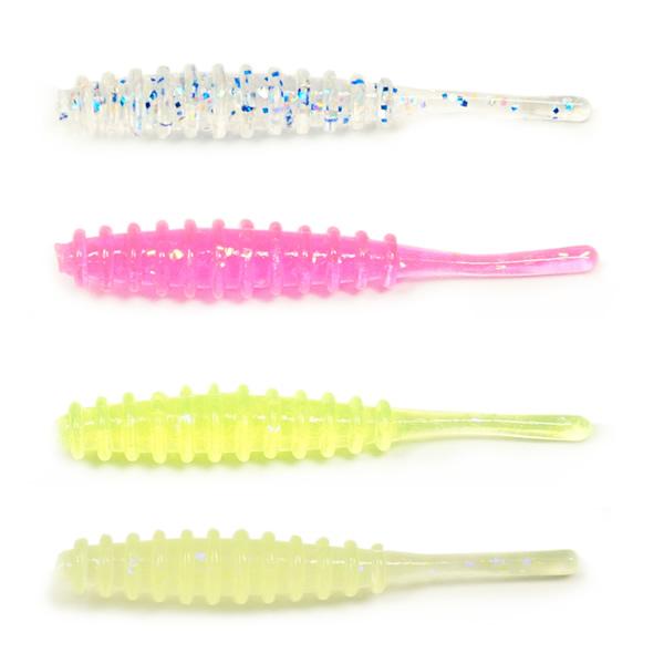 ●ひとくちサイズのリングボディと逆テーパー形状ピンテールの波動でアジをバイトに誘います。今までに無いダーク系グローカラーもラインナップして様々な状況に対応可能。アジだけでなく、メバルにも有効です。誘発。