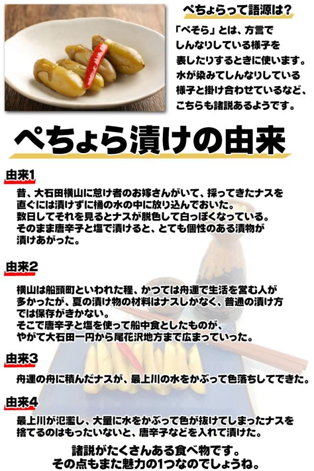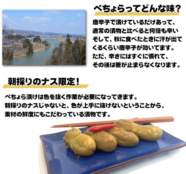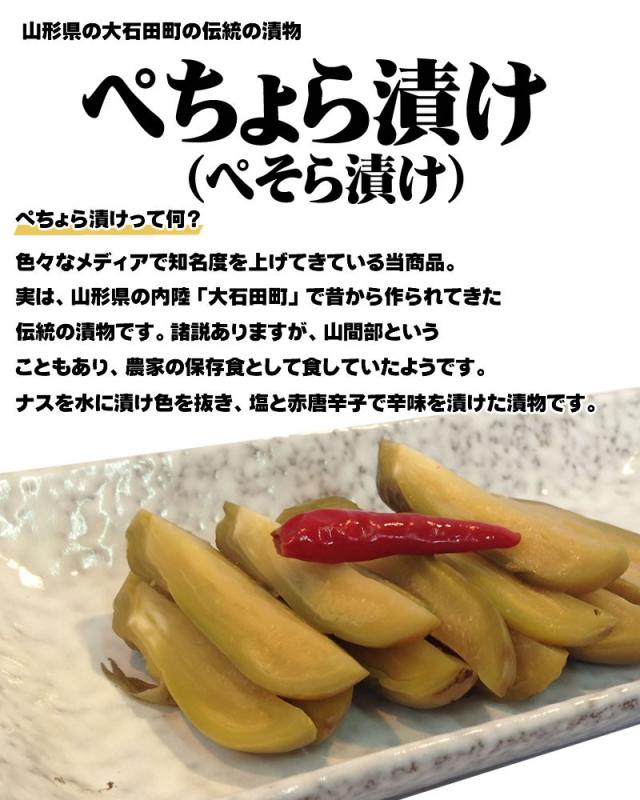 ・山形の伝統漬物「ぺそら(ぺちょら)漬け」色々なメディアで知名度を上げて生きている当商品。山形県の「大石田町」で昔から作られてきた漬物です。ナスを水煮漬け色を抜き、塩と赤トウガラシで辛味を漬けた漬物です。・「ぺそら」とは、方言でしんなりしている様子を表してます。水が染みてしんなりしている様子と掛け合わせているなど、諸説あります。・ぺそらの味は他の漬物と比べると数倍辛いです。唐辛子で漬けているためです。その辛さに汗が止まらなくなるかもしれませんが、慣れてしまうと、箸は止まらなくなります。・朝採りのナス限定です。ぺそら漬けは色を抜く作業が必要になってきます。朝採りのナスじゃないと、上手に色が抜けないことから、素材の鮮度にもこだわっている漬物です。