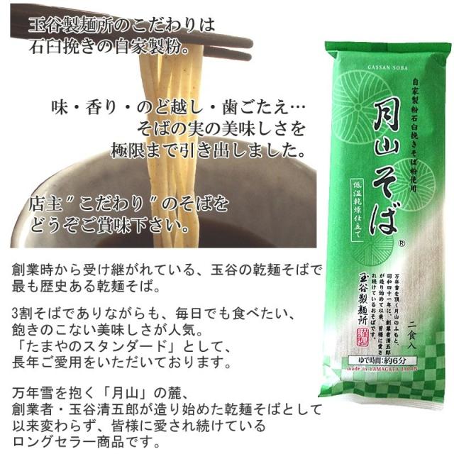 創業時から受け継がれている、玉谷の乾麺そばで最も歴史ある乾麺そば。3割そばでありながらも、毎日でも食べたい、飽きのこない美味しさが人気。「たまやのスタンダード」として、長年ご愛用をいただいております。万年雪を抱く「月山」の麓、創業者・玉谷清五郎が造り始めた乾麺そばとして以来変わらず、皆様に愛され続けているロングセラー商品です。 ・当商品はメール便にて発送でポスト投函となります。そのため、代引き支払い不可、配達日時指定不可となりますことをご了承お願いします。